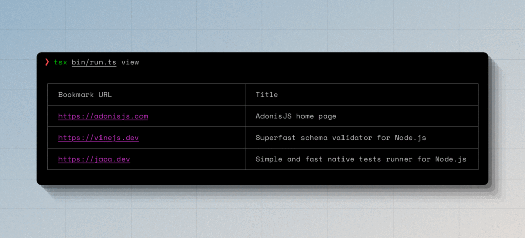 We will learn how to trigger prompts, display a list of bookmarks as a table, and write programmatic tests for all the commands. The app we are building is just for learning purposes and not to produce a complicated real-world bookmarks application.